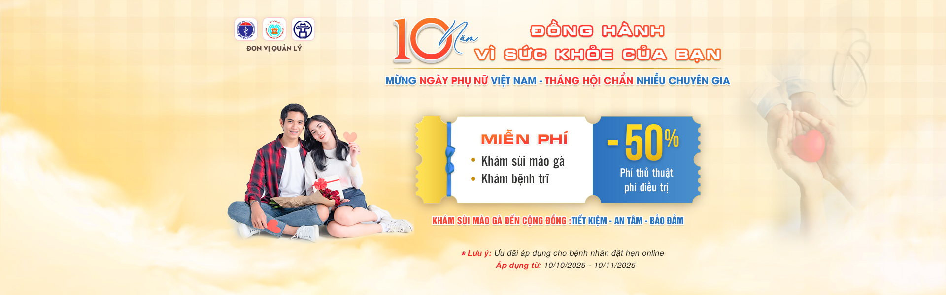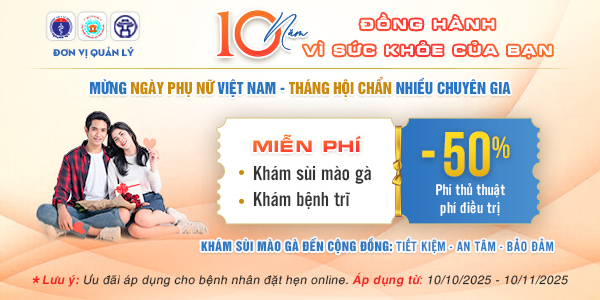 Đặc biệt: Phòng khám đang có chương trình ưu đãi tri ân bao gồm miễn phí 100% khám lâm sàng, ưu đãi khám sùi mào gà chỉ 950K (giá gốc 2.050K) và giảm 50% phí thủ thuật dành cho những bệnh nhân NHANH TAY ĐẶT HẸN KHÁM TRỰC TUYẾN.[Tôi muốn nhận ưu đãi]
